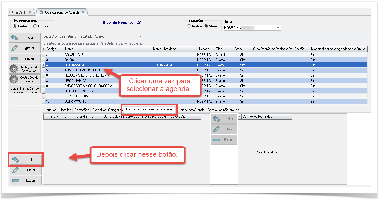 1. Para começar a configurar essa dinâmica é necessário estar na tela de Configuração de Agendas com a agenda selecionada e clicar na aba Restrições por Taxa de Ocupação e depois no botão Incluir: