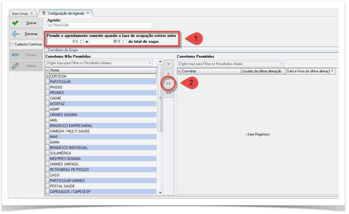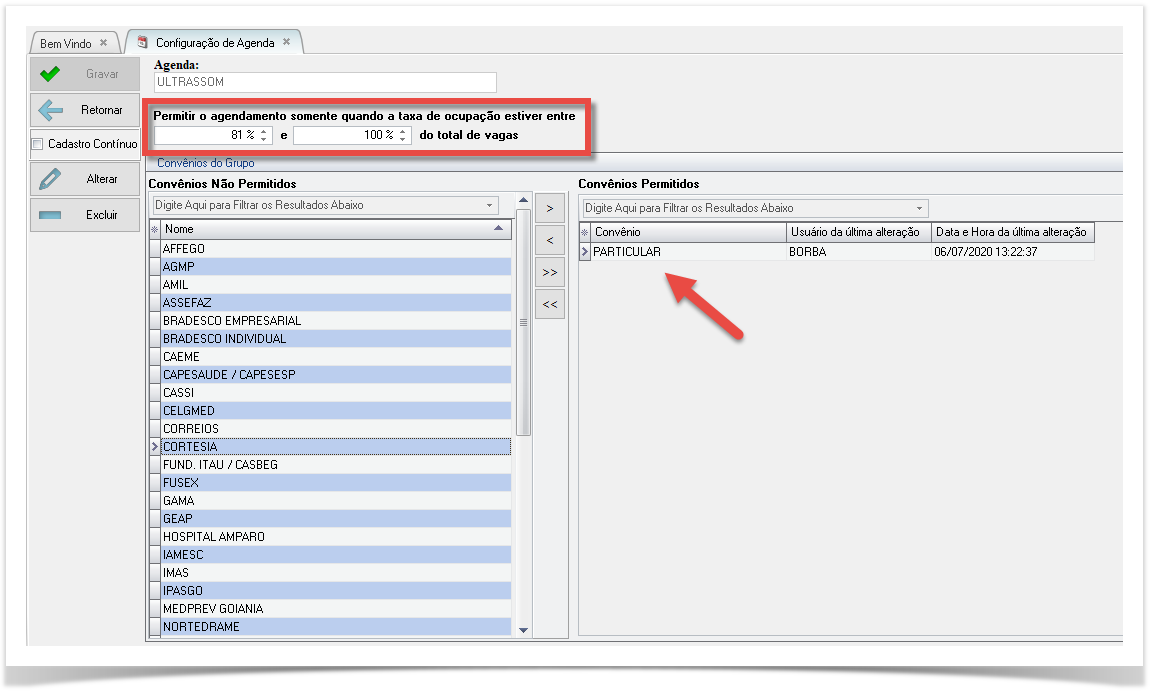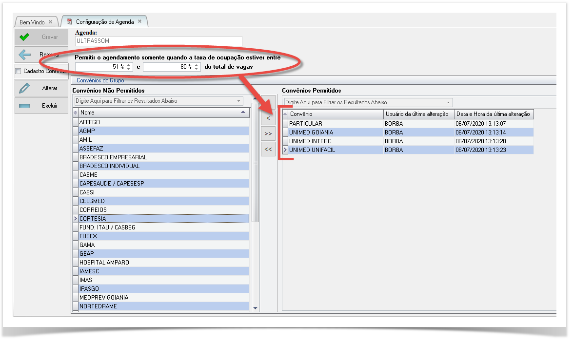 Repare que os percentuais estão entre 81% e 100% ,ou seja ,naquele dia em que a agenda estiver 'quase cheia' só será permitido agendar pacientes dos convênios que estão do lado direito.