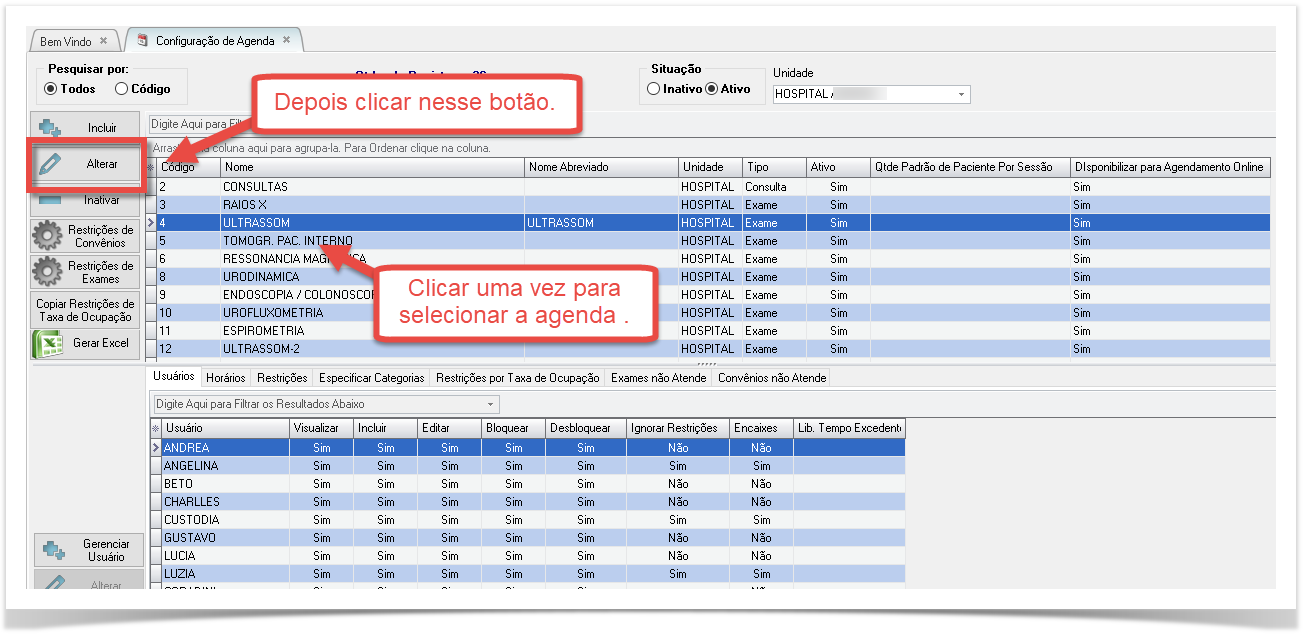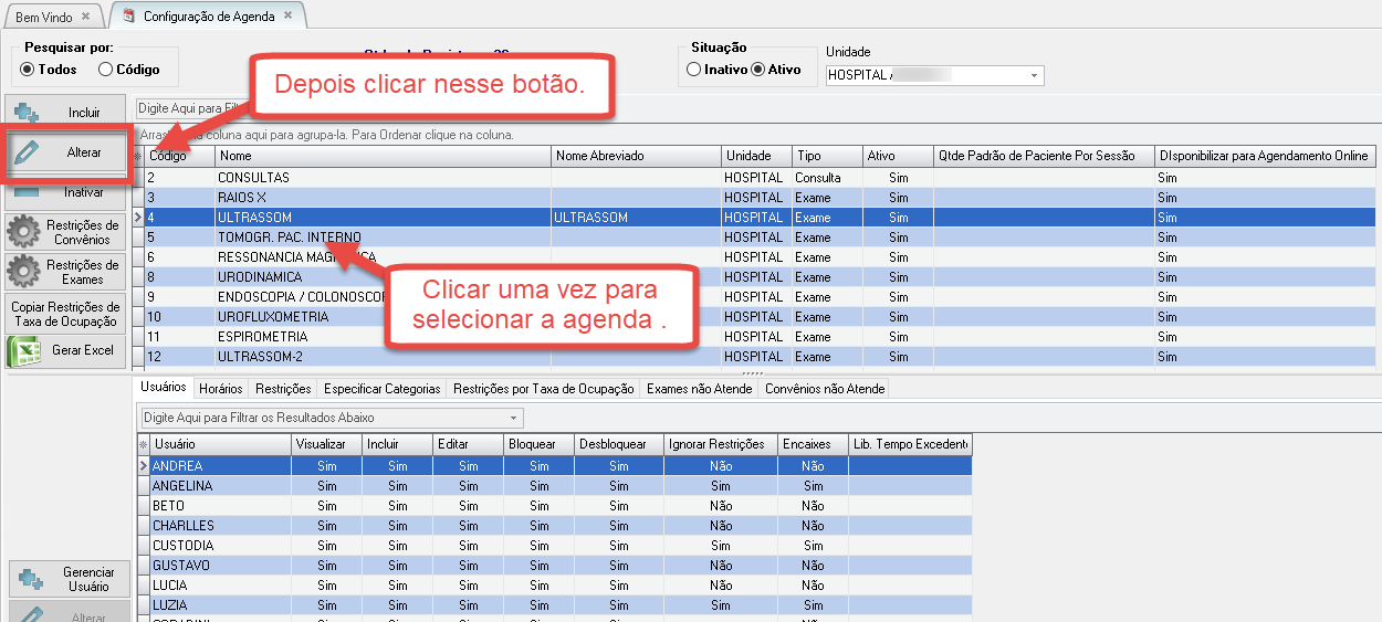 Para fazer a configuração acima é necessário acessar a tela de Configuração de Agendas e com a agenda selecionada clicar na opção Alterar: