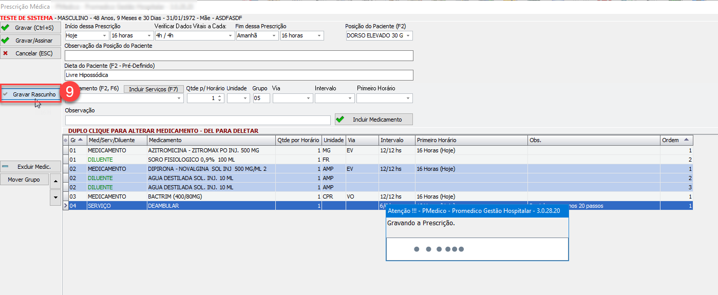 Esta ação realiza o salvamento da prescrição no ponto em que ela estiver, de modo provisório, permitindo que ela possa ser novamente acessada para a realização de ajustes e/ou correções, antes do salvamento definitivo.