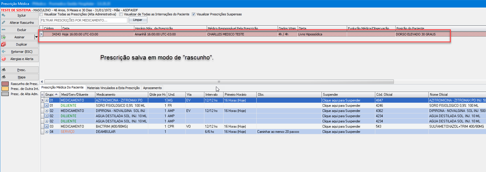 O sistema fará o salvamento da prescrição e voltará para a tela principal, destacando a prescrição salva em modo de rascunho com uma cor próxima ao rosa-avermelhado.