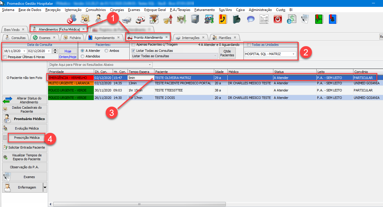 1) Fazer uma prescrição através da Tela do Médico (Ficha Médica), aba "Pronto Atendimento".