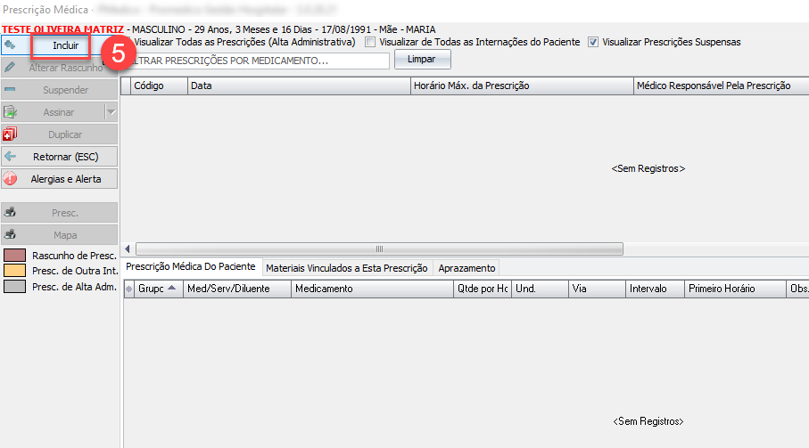 5) Clique no botão "Incluir" para criar uma nova prescrição e preencha os campos solicitados na tela.