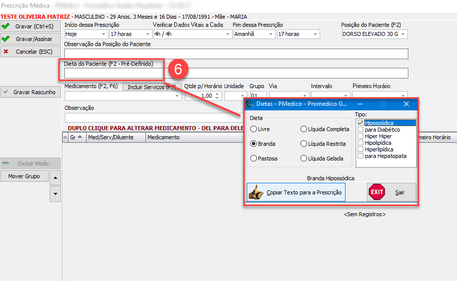 6) No campo "Dieta do Paciente", digite a dieta conforme desejado, ou pressione a tecla "F2" no teclado para acessar a janela de opções.