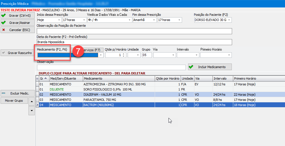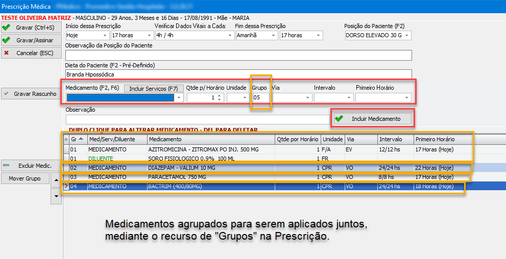 Ao digitar os medicamentos, o sistema organiza automaticamente os itens em grupos, para impressão posterior. Caso deseje que dois ou mais itens fiquem agrupados dentro de um mesmo quadro, informe o mesmo número de "grupo" para todos eles.