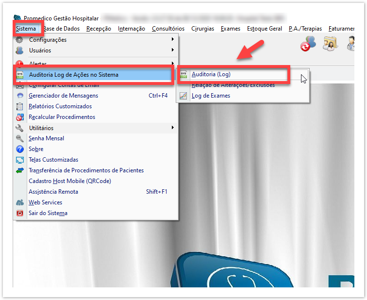 Após ter feito login no sistema, acesse o menu Sistema > Auditoria Log de Ações no Sistema > Auditoria (Log) .