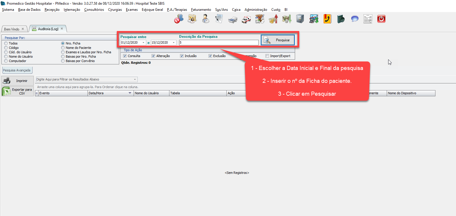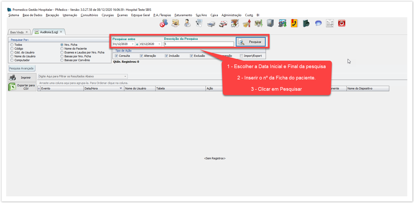 O usuário deve escolher uma Data Inicial e Data Final, inserir o nº da ficha do paciente no campo de pesquisa e clicar no botão Pesquisar.