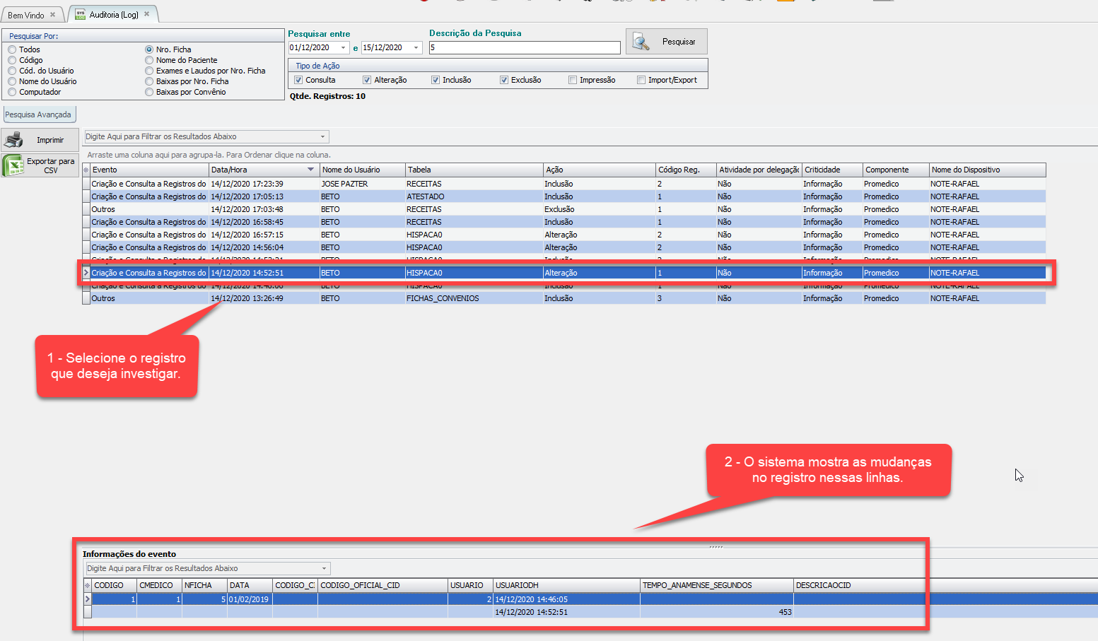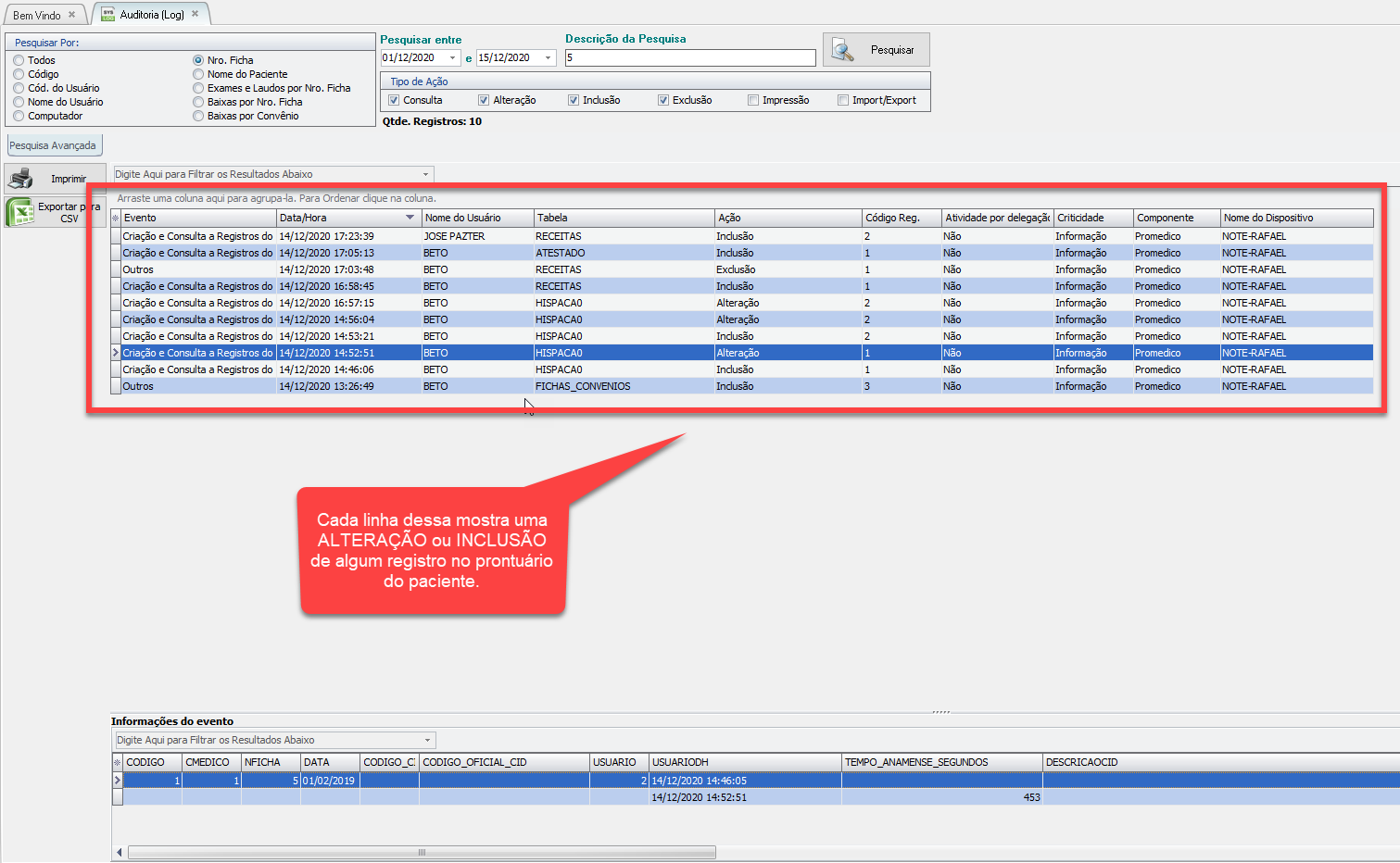 O sistema irá mostra todos os resultados da pesquisa efetuada, cada linha é um registro de alguma ação no sistema.