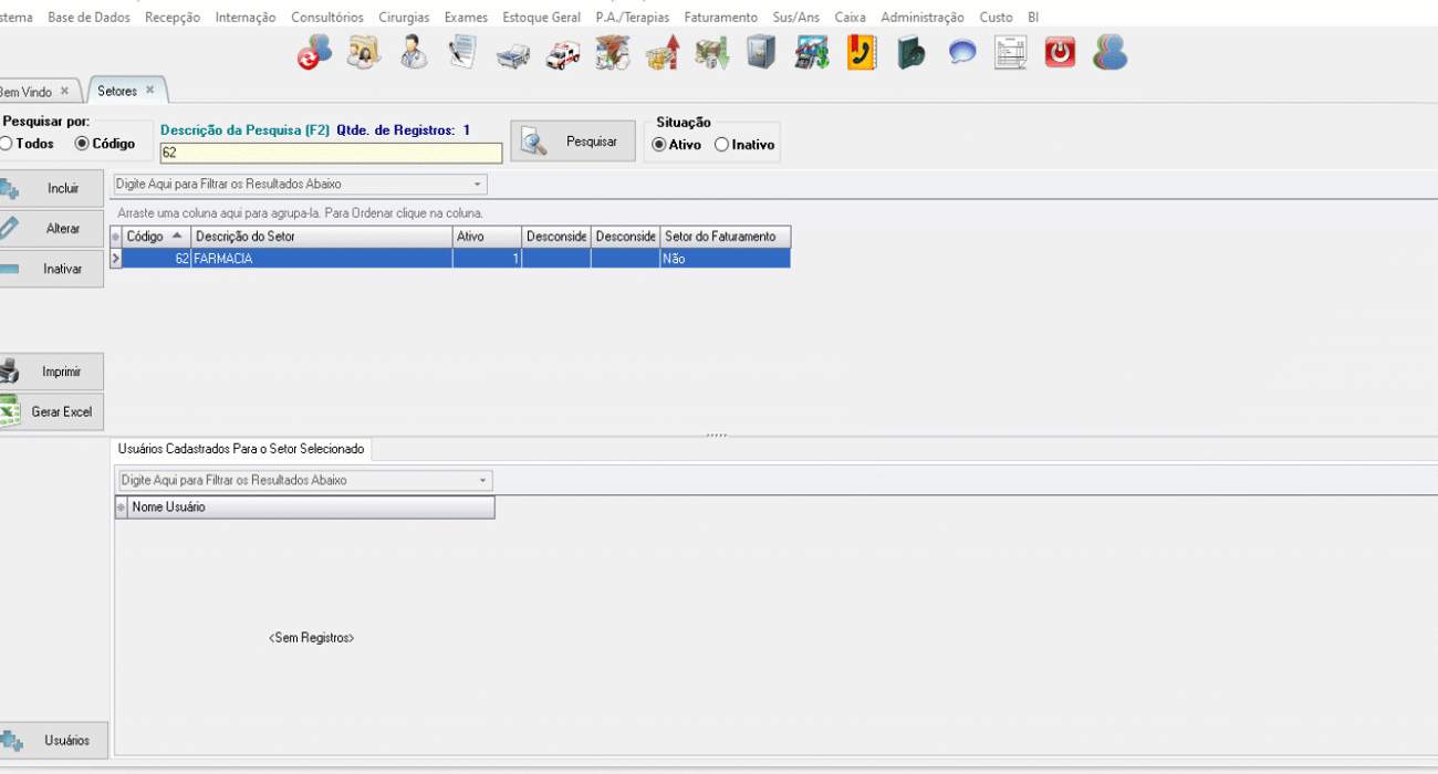 . Pode-se também criar setores que não vão controlar estoque, porém irão dar saída para o paciente, um exemplo é o Faturamento que pode ser cadastrado como setor para poder incluir itens na conta dos paciente sem alterar o controle do estoque da Farmácia e Almoxarifado.