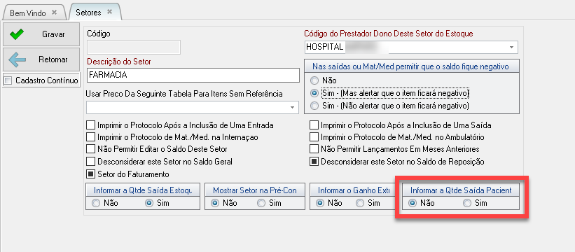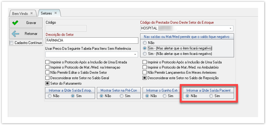 6. Marcar se o setor vai dar saída para o paciente (Informar Qtde Saida do Paciente).