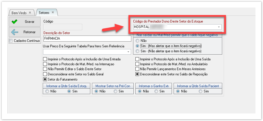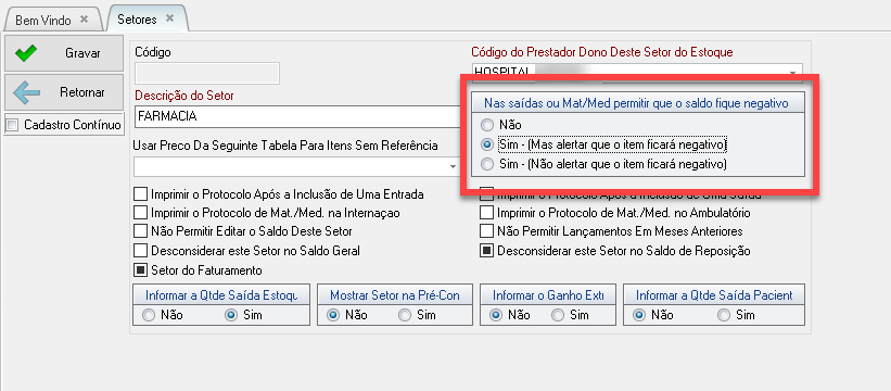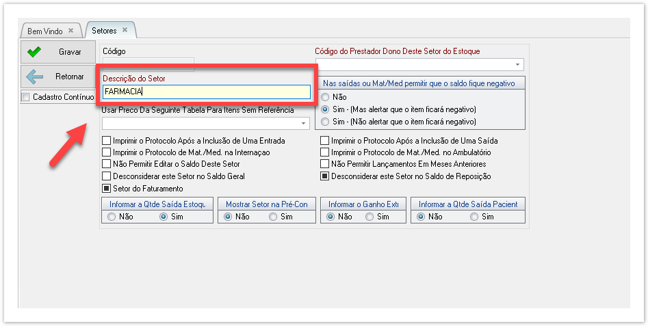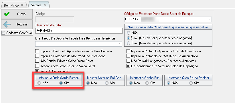 5. Marcar se o setor deve controlar estoque (Informar a Qtde de Saida do Estoque).