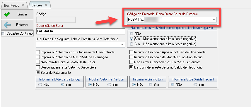 4. Escolher o Prestador dono do setor. Isso indica que todos os mat/med que saírem desse setor será faturado para o prestador em questão.