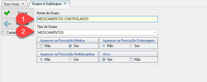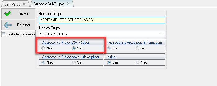 3. Escolher se o Grupo irá aparecer na Prescrição. Com isso podemos marcar quais grupos não queremos que apareça para o médico prescrever, como Materiais de Limpeza, Escritório ou Alimentação.