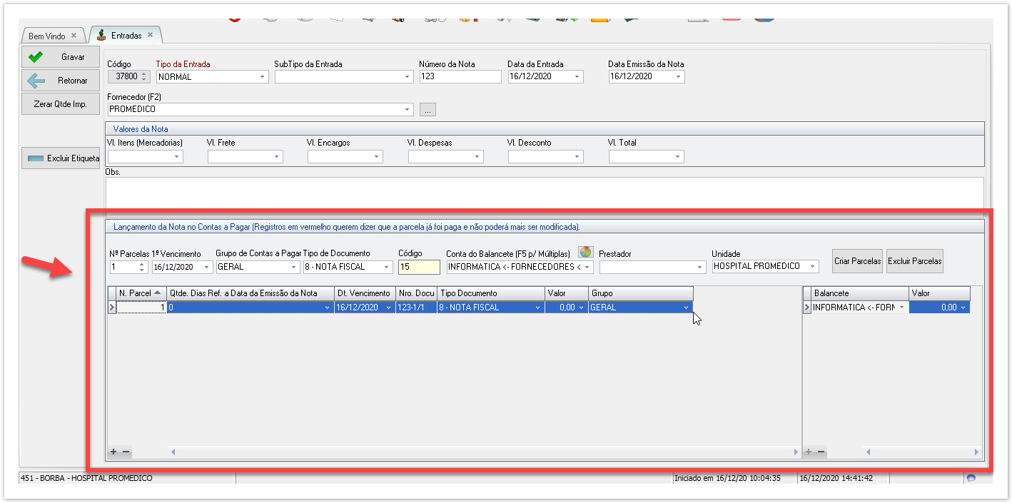 Na inclusão da entrada também é possível já incluir as formas de pagamento da mesma que gerará automaticamente as parcelas no Contas a Pagar.