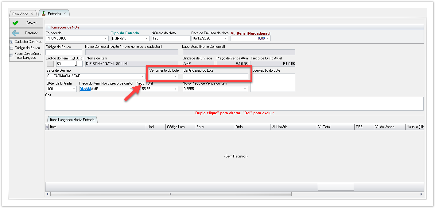9. Caso item possua controle de lote e data de vencimento será exigido que seja informado também o VENCIMENTO DO LOTE e IDENTIFICAÇÃO DO LOTE.