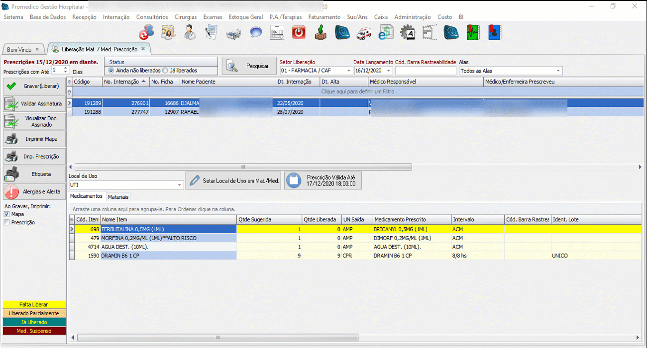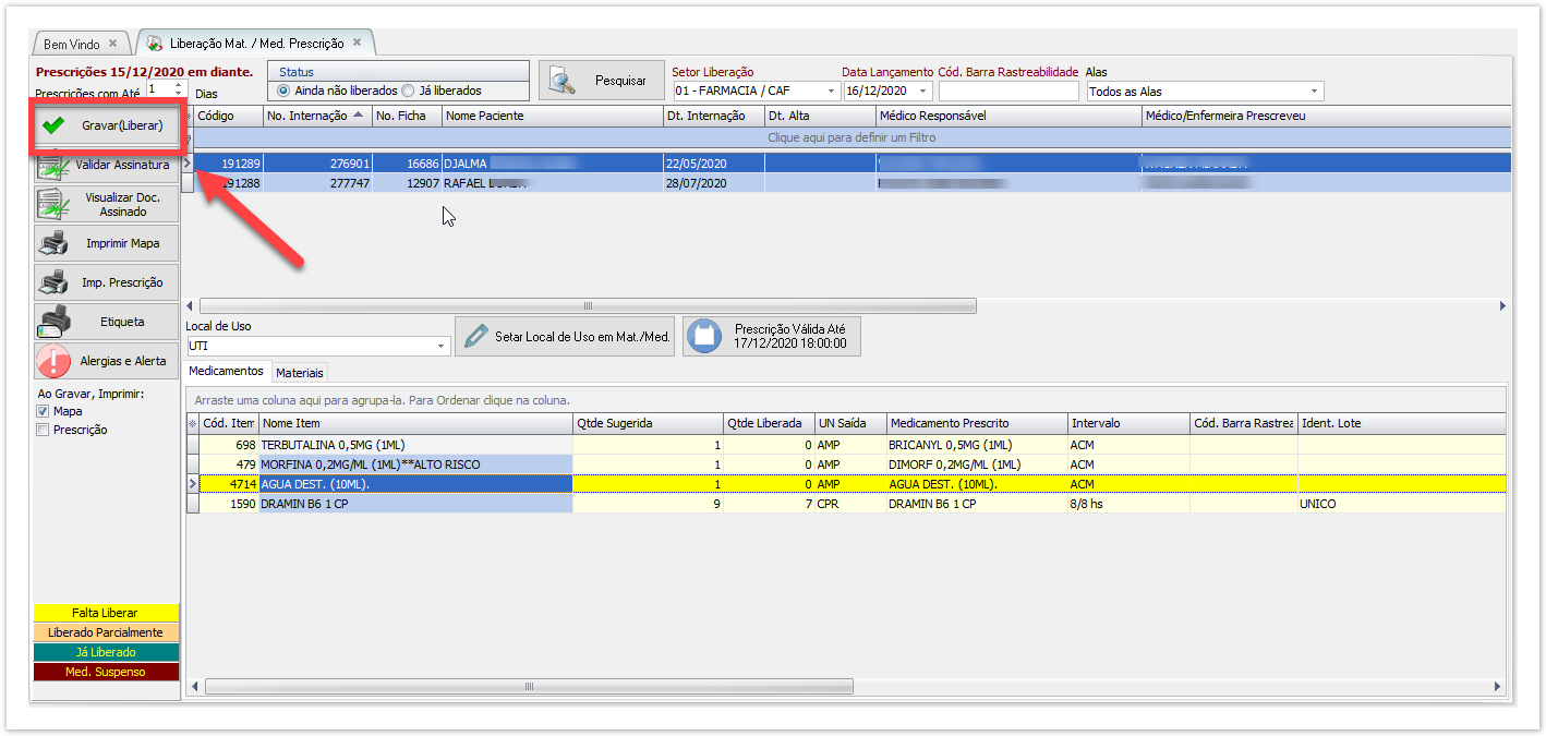 É com a Liberação através da tela LIBERAÇÃO DE MAT/MED. PRESCRIÇÃO que a Farmácia irá “dispensar” a prescrição com seus Medicamentos e Materiais vinculados.