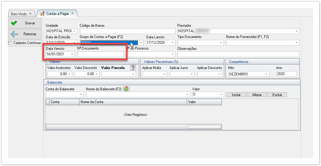 5. Informar o valor do documento a ser pago e também informar as contas balancetes e seus respectivos valores e depois basta GRAVAR para finalizar a inclusão do registro:
