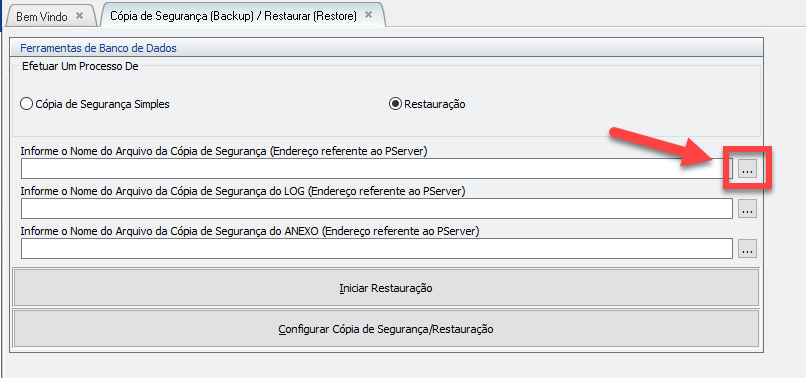 6. O sistema irá fornecer a opção de escolher qual backup será restaurado em cada um dos bancos de dados. Clicar no botão '...' para que o sistema mostre as opções.