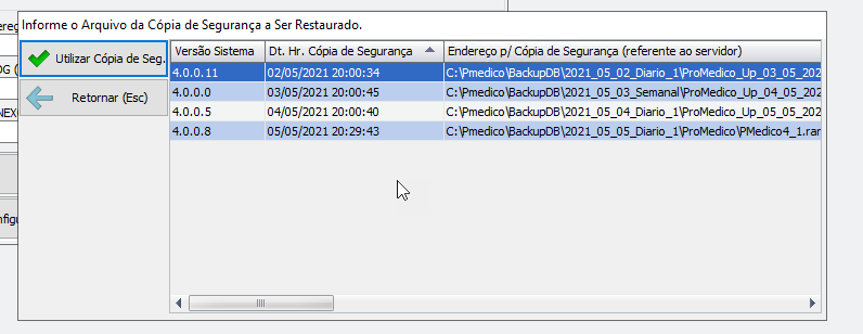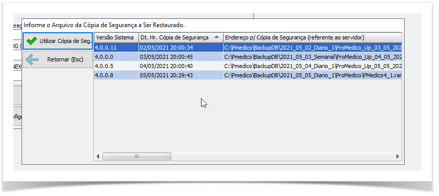 Dentro módulo de "Cópia de Segurança (Backup)/Restaurar (Restore)" do sistema, o administrador do sistema ou usuário com permissões correspondentes, poderá executar uma restauração dos Bancos de Dados do sistema Promedico.