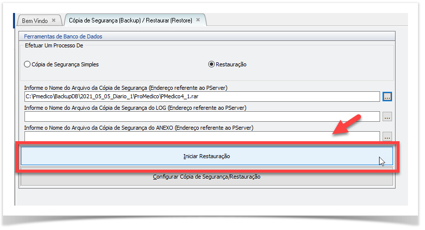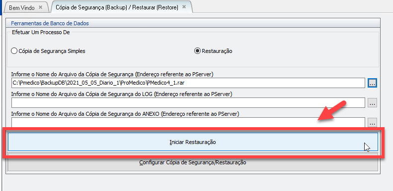 7. Depois de escolher os arquivos de backups dos 3 bancos de dados clicar na opção 'Iniciar Restauração'.