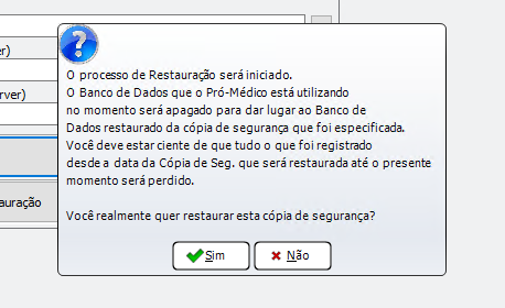 Ao responder Sim o backup será restaurado e ao final do processo o sistema irá pedir para fechar e abrir novamente.