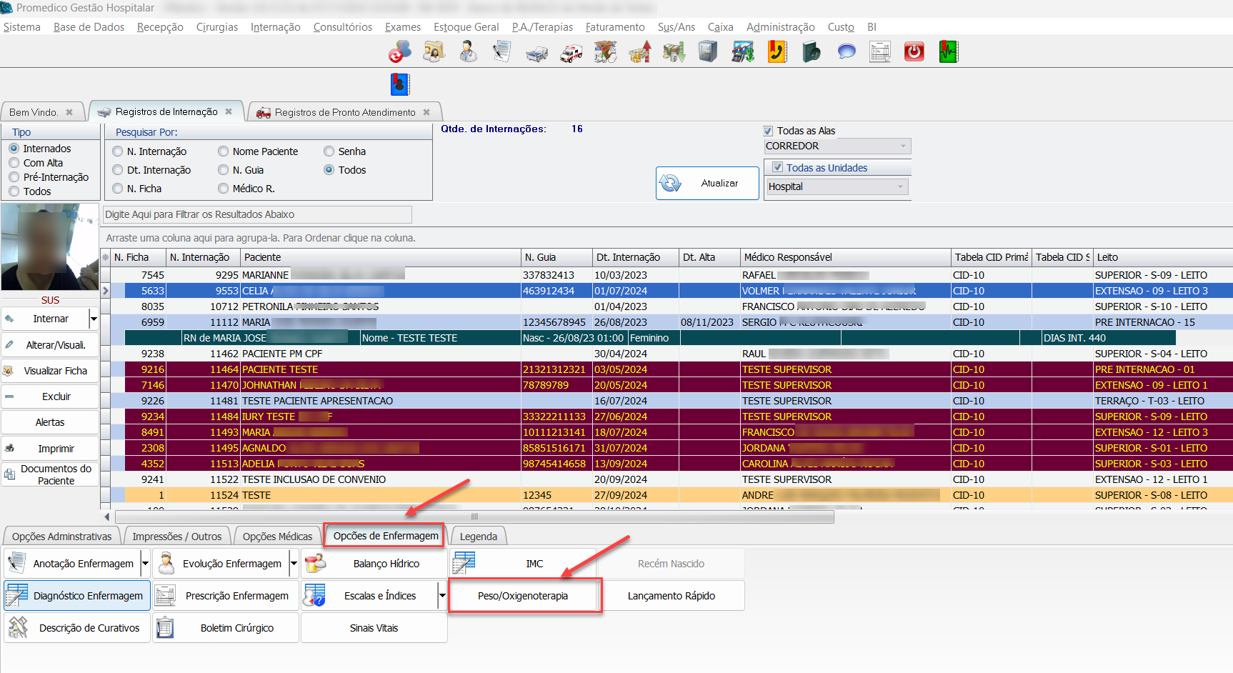 2) Após ter acessado a tela desejada e localizado o paciente, selecione a aba "Opções de Enfermagem" na parte inferior da tela, clicando 1x sobre ela.