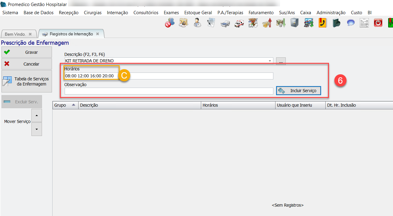 8) Após todos os serviços incluídos, clique no botão "Gravar" para salvar a prescrição e retornar para a tela principal de prescrições de enfermagem.