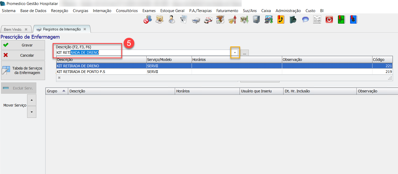 Opcionalmente, pode-se fazer uso da listagem de serviços pré-cadastrados na Tabela de Serviços de Enfermagem. Para visualizar as opções disponíveis, clique na setinha apontada para baixo, na extremidade direita do campo "Descrição (F2, F3, F6)", conforme ilustrado no quadro laranja acima.