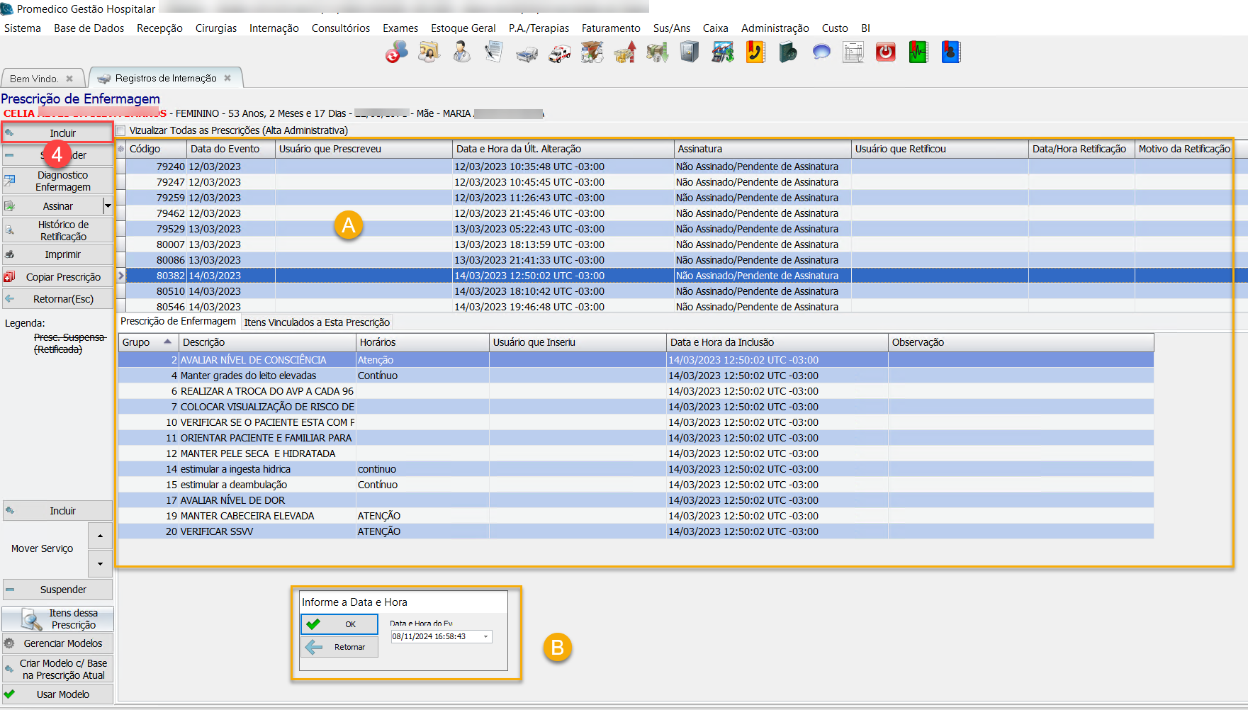 Será aberta a janela para que o usuário informe a data e hora da prescrição, conforme ilustrado na imagem abaixo, no quadro "B".