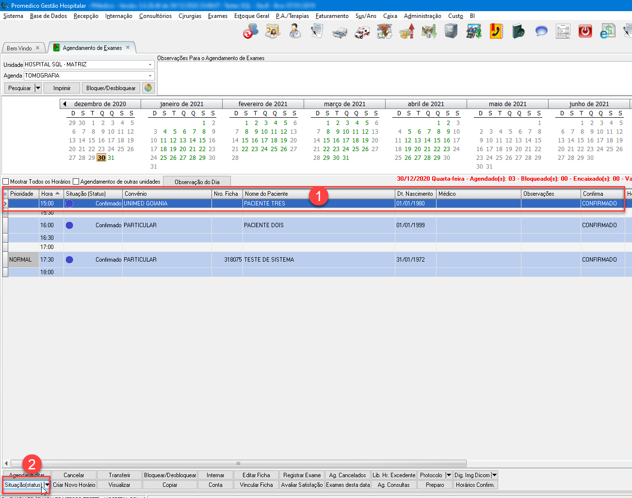 Esta confirmação pode ser realizada através do botão "Situação (status)" diretamente na tela principal de agendamento de exames.