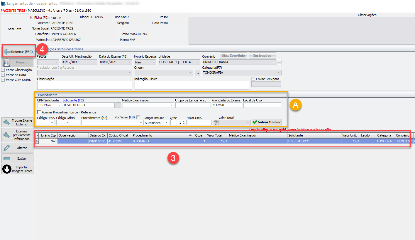4) Caso esteja tudo correto, clique no botão "Retornar (Esc)" para dar prosseguimento ao processo de registro de exames.