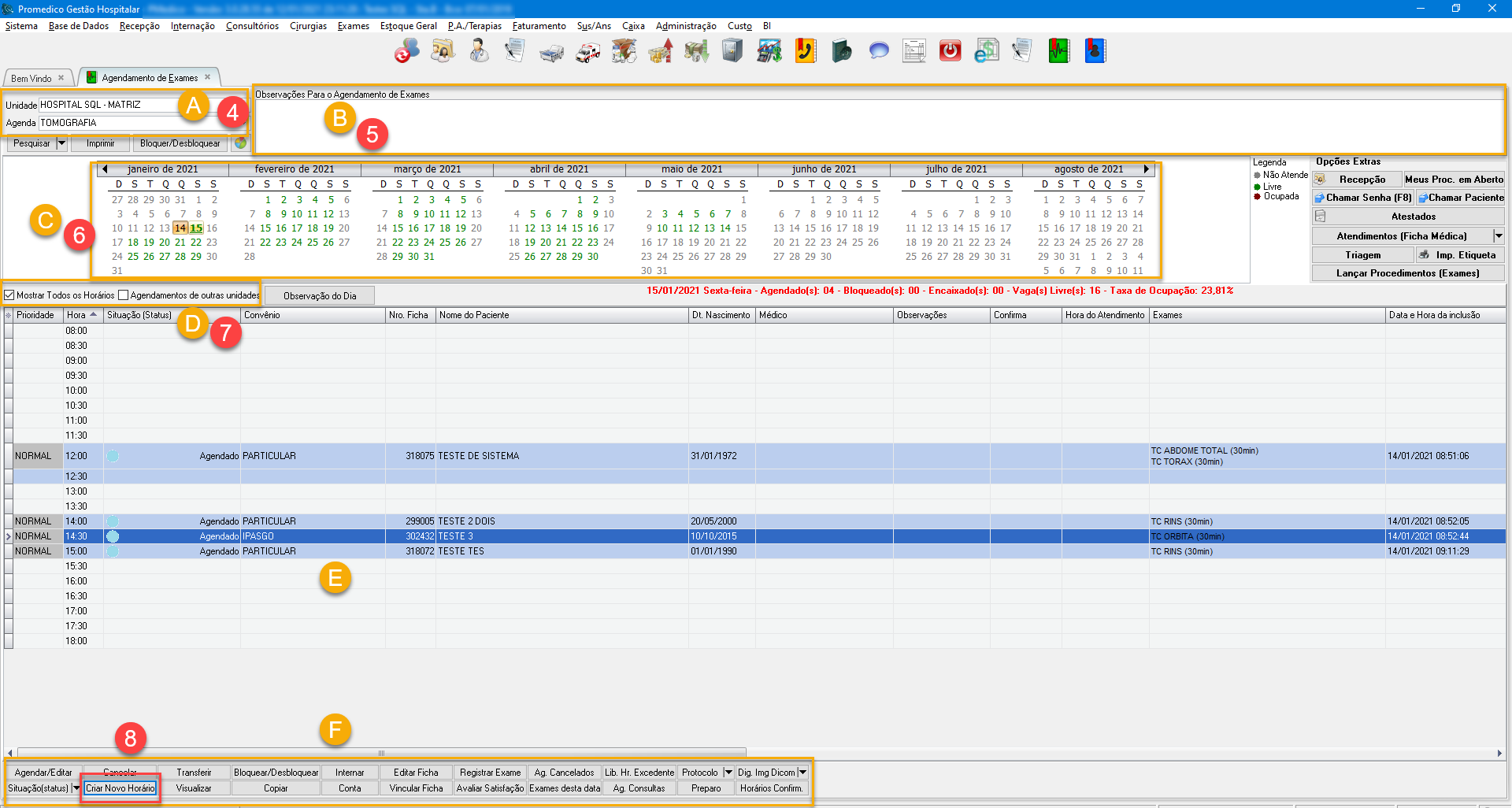 Caso a agenda do dia selecionado possua pacientes agendados, os respectivos horários no serão mostrados no "Grid de Agendamentos" (quadro "E") como "ocupados", trazendo as informações pertinentes a cada agendamento.   Igualmente, caso ainda haja horários disponíveis, os mesmos também serão mostrados como "linhas em branco", ou seja, não haverá nenhuma informação de agendamento nessas linhas, deixando claro que estes horários poderão ser utilizados para criar novos agendamentos.