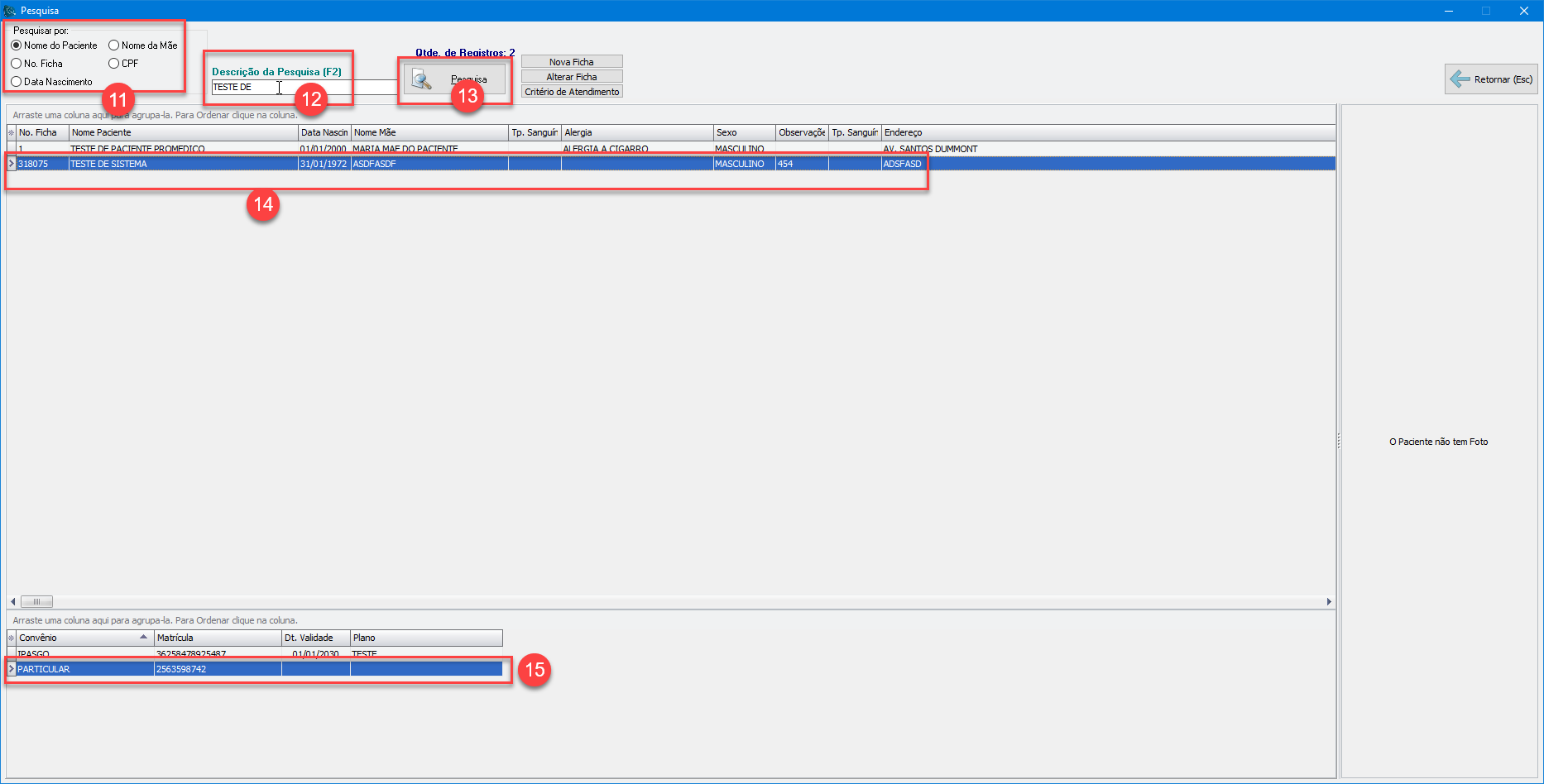 14) Caso o termo pesquisado seja encontrado no banco de dados pelo sistema, seus respectivos dados serão mostrados no grid logo abaixo.  Selecione o paciente desejado clicando 1x em cima do mesmo.