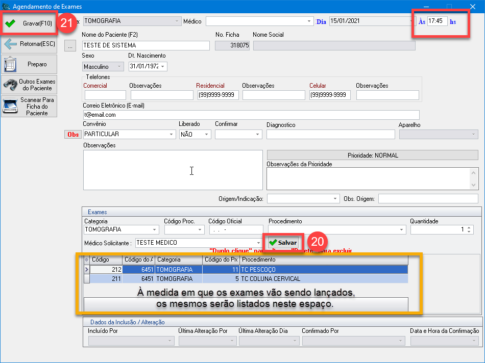 21) Clique no botão "Gravar (F10)" para gravar os dados do agendamento e retornar para a tela principal de agendamento de exames.