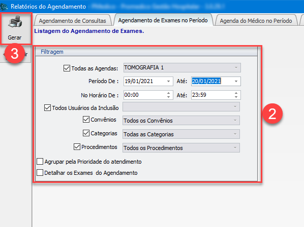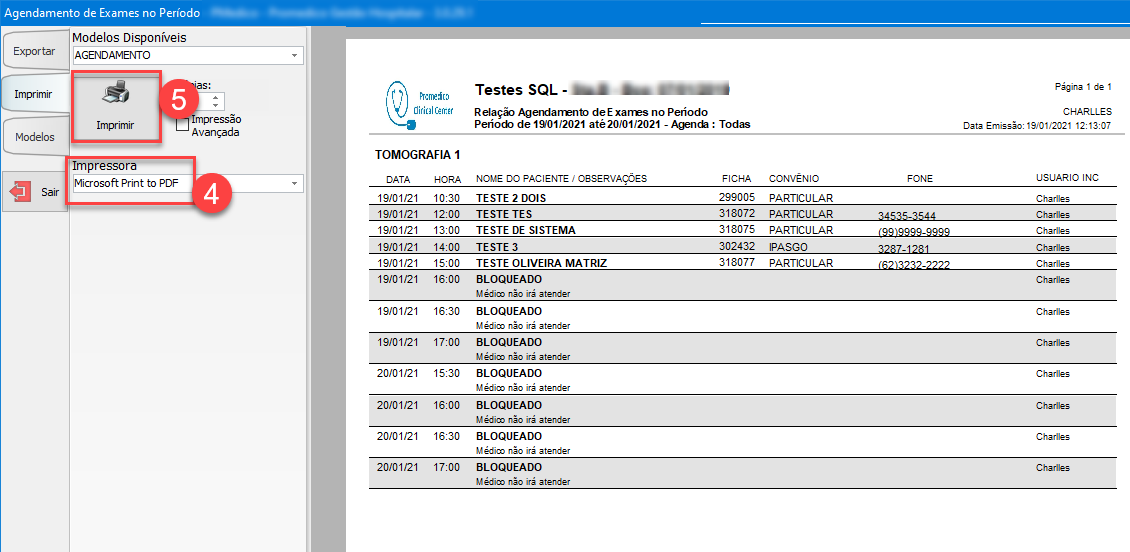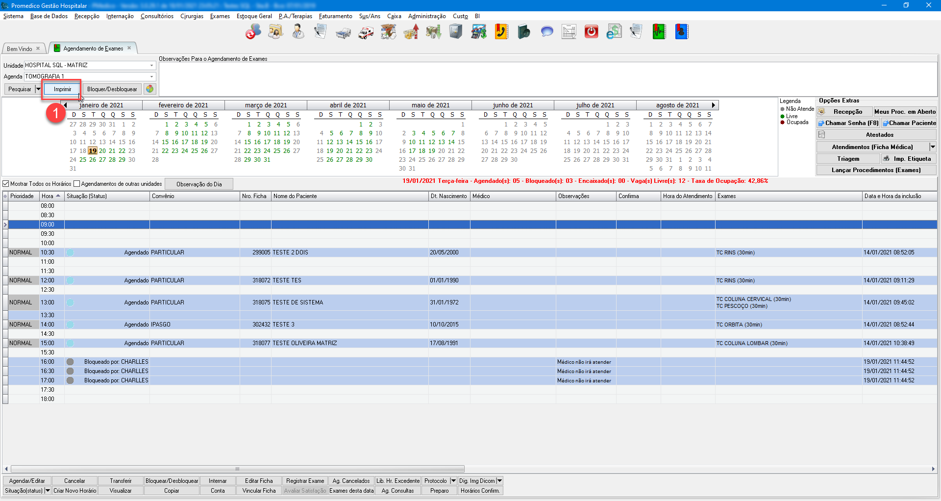 O sistema possibilita gerar uma impressão da Agenda de Exames, contendo todos os horários reservados, bem como os horário bloqueados.