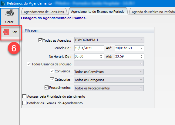 6) De volta à janela de impressão, clique no botão "Sair" para voltar à Tela principal de Agendamento de Exames.