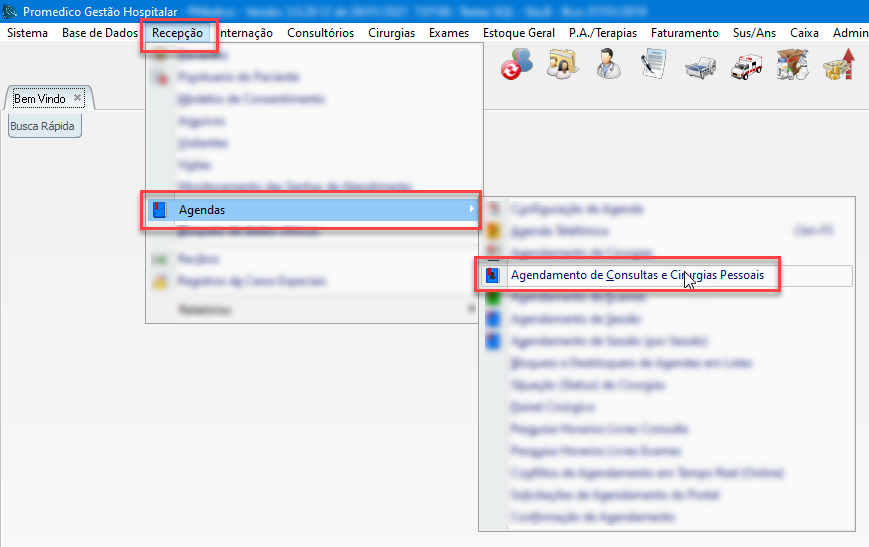 No menu de Agendas temos atalhos para todas as agendas do sistema, dentre elas, o Agendamento de Consultas, que é acessada através do caminho ilustrado na imagem abaixo.