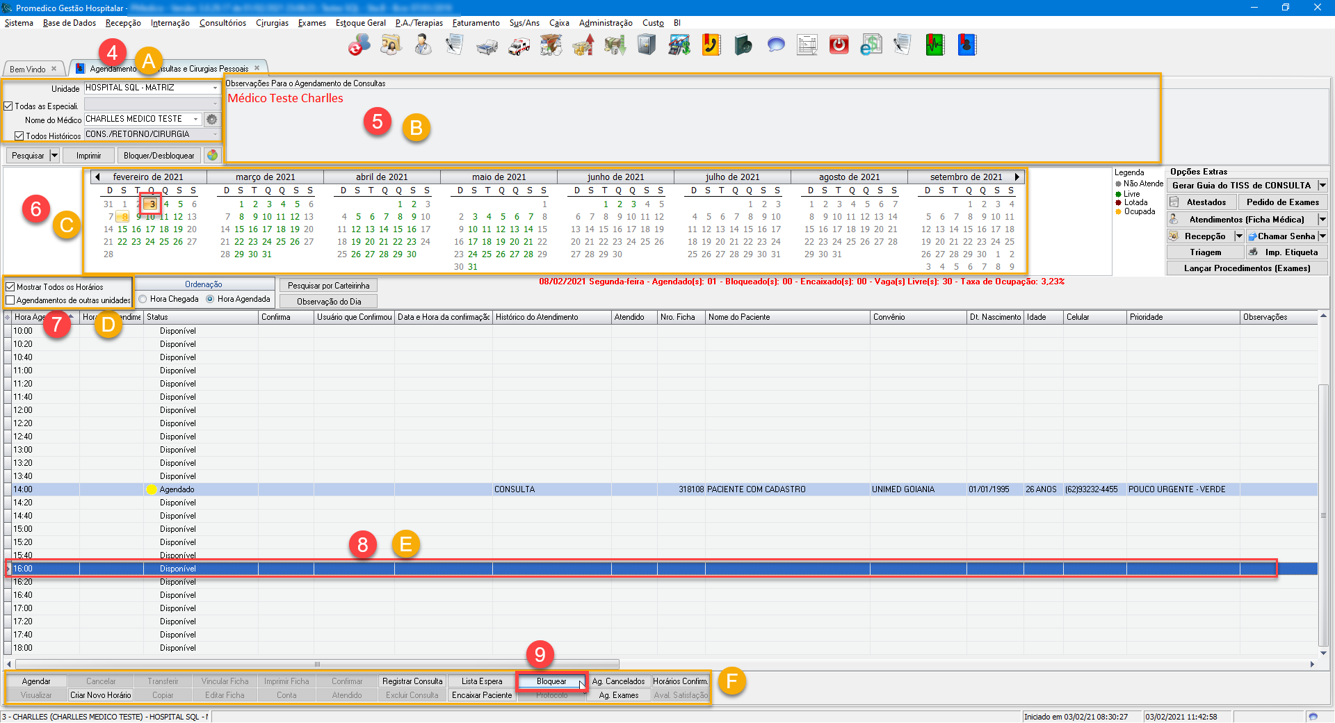 8) No "Grid de Agendamentos" (quadro "E"), clique 1x em cima do horário/agendamento disponível, ao qual deseja bloquear, para selecioná-lo (isso fará com que a linha toda fique com cor azul escuro).