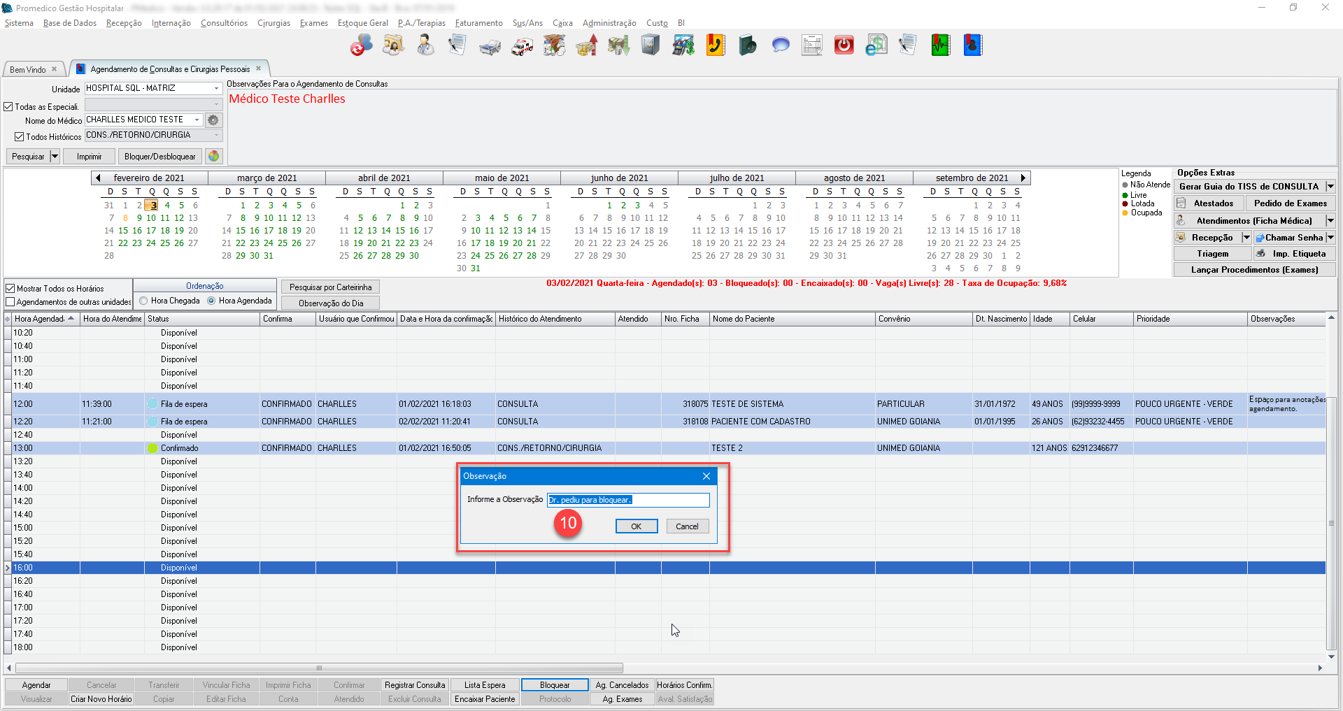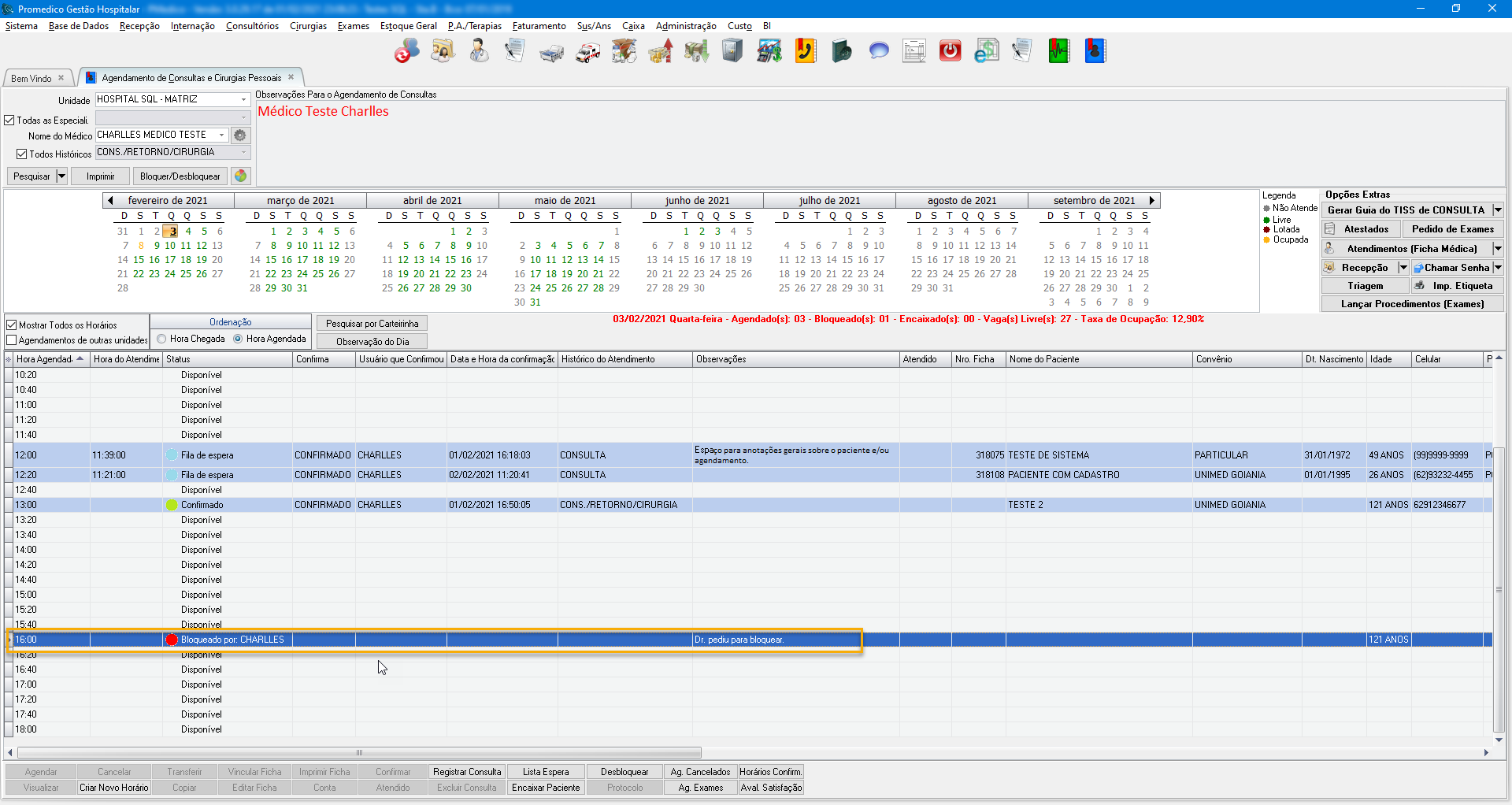 Para bloquear um horário, o mesmo precisa obrigatoriamente estar disponível (sem nenhum paciente agendado).