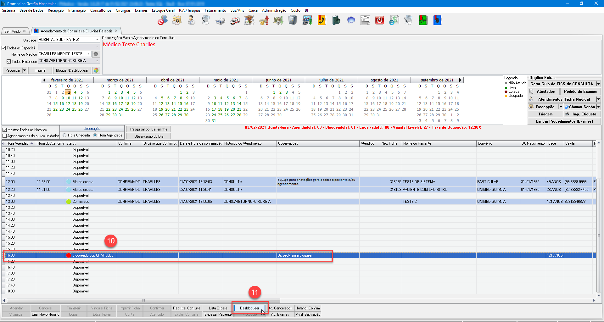 Demonstrar como bloquear / desbloquear um horário na Agenda de Consultas.