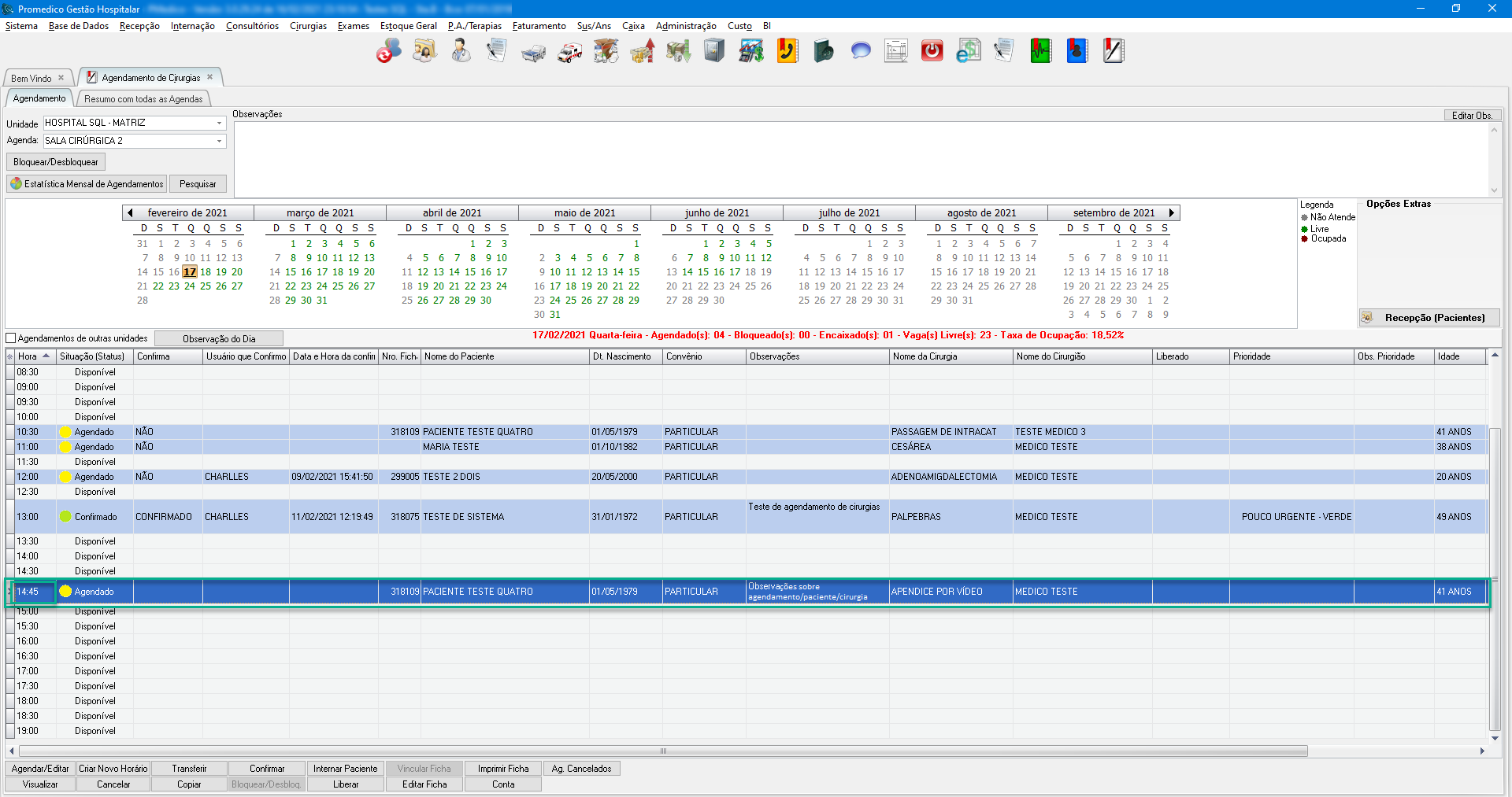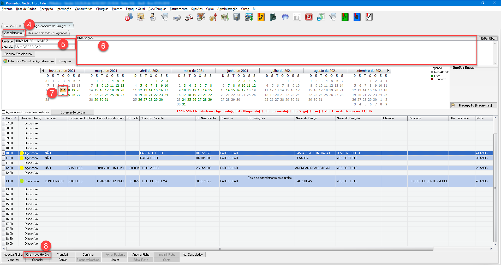Para conhecer a tela de agendamento de cirurgias e saber mais sobre os componentes e suas respectivas funções, veja a sessão "Conhecendo a tela de Agenda de Cirurgias".