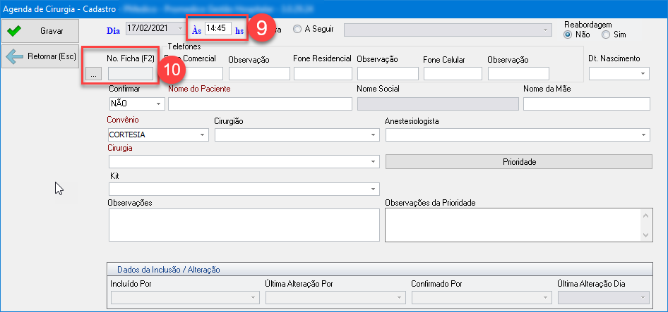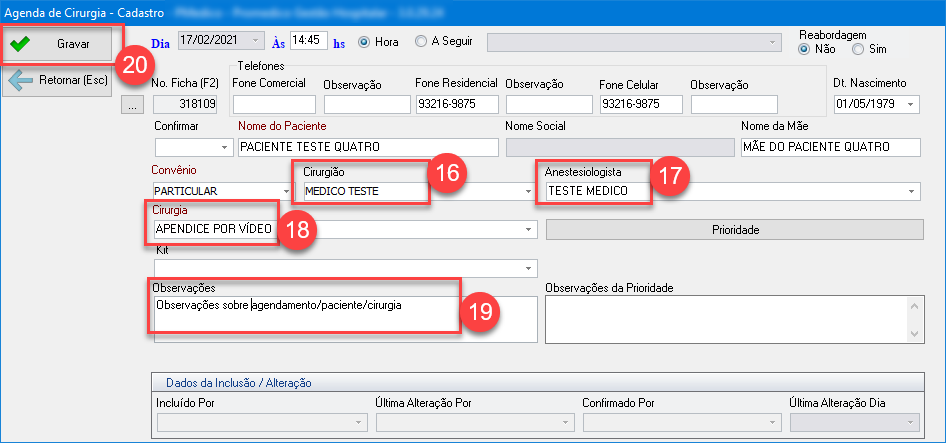 20) Clique no botão "Gravar" para gravar os dados do agendamento e retornar para a tela principal de agendamento de cirurgias.