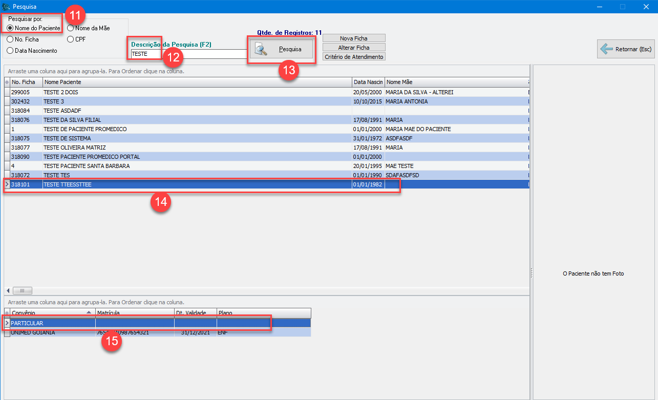 14) Caso o termo pesquisado seja encontrado no banco de dados pelo sistema, seus respectivos dados serão mostrados no grid logo abaixo. Selecione o paciente desejado clicando 1x em cima do mesmo.