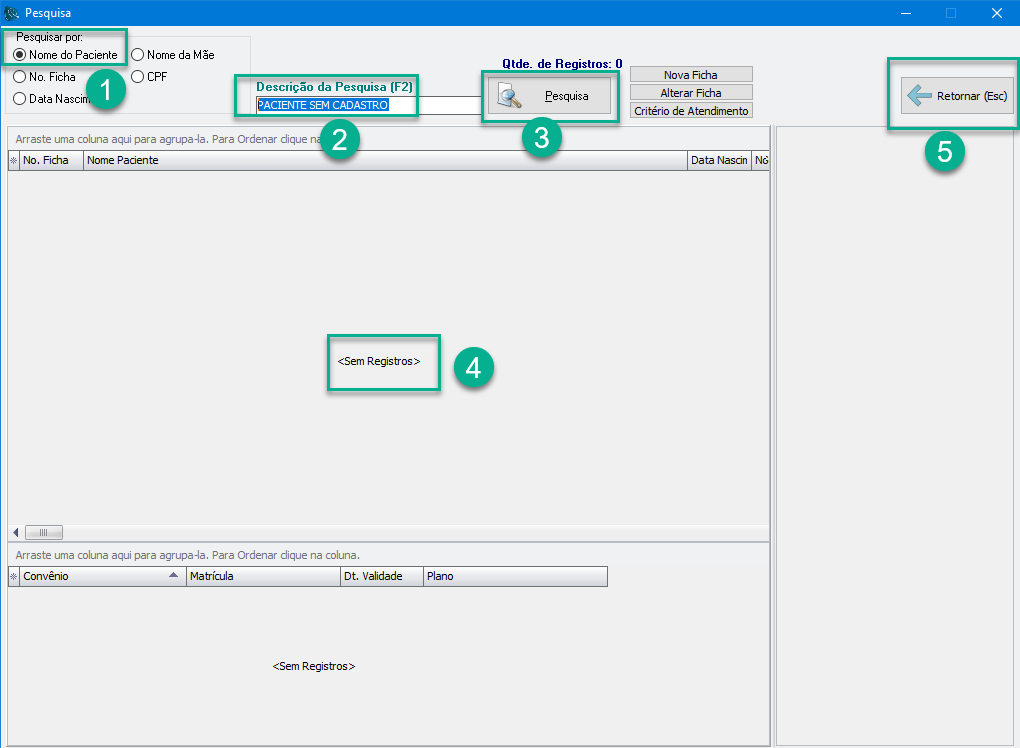 Caso não seja encontrada no banco de dados nenhuma correspondência para quaisquer dos termos pesquisados (Nome do Paciente, Nome da Mãe, CPF, Nº de Ficha ou Data de Nascimento), clique no botão "Retornar (Esc)" para desistir da pesquisa e retornar para a tela de inclusão de agendamento.