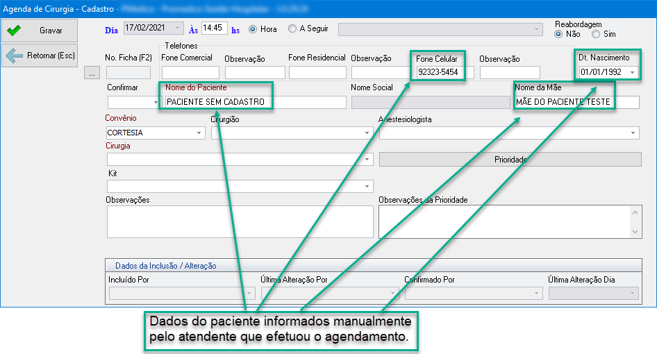 De volta à janela de inclusão de agendamento de cirurgias, caso não tenha conseguido localizar o cadastro do paciente, informe os dados manualmente, de forma a poder continuar com a inclusão do agendamento.