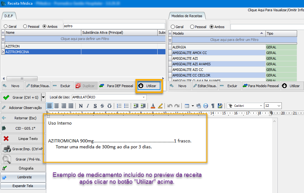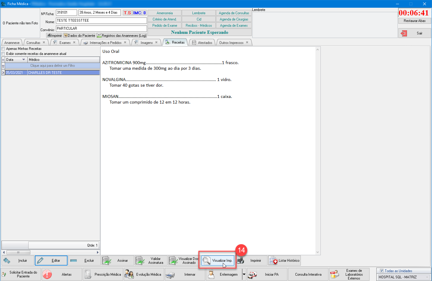 A prescrição de medicamentos ao paciente (conhecida como "Receita Médica"), pode ser realizada a partir da tela de "Prontuário Médico (Ficha Médica)".