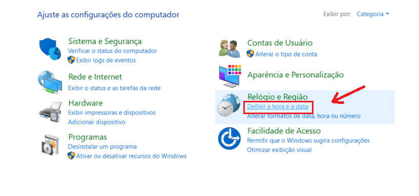 Ao abrir o painel de controle, certifique-se que a exibição está no formato Categoria, e escolha a opção Definir a hora e a data.