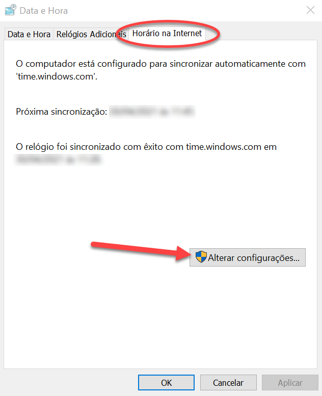 Para configurar um NTP vá em configurações de Data e Hora na aba - Horário na Internet e clique em Alterar Configurações.