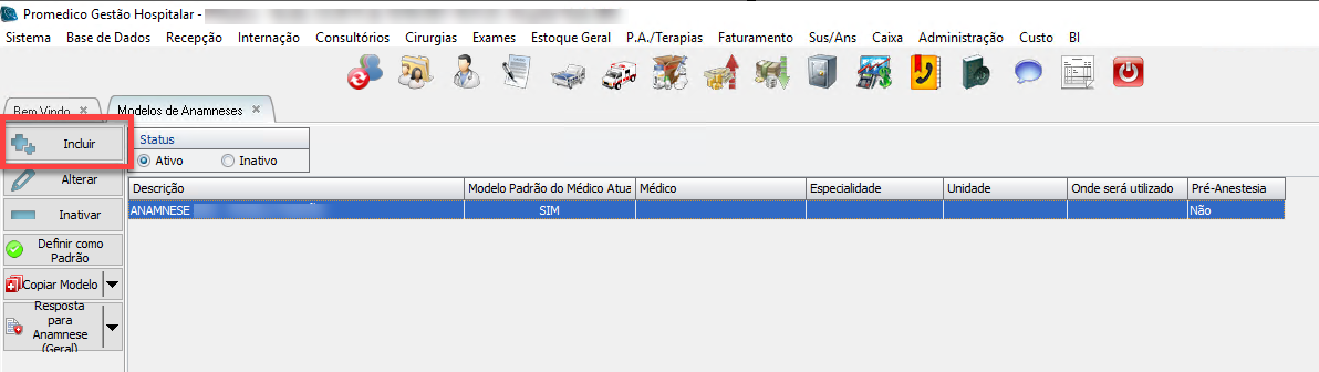 3) Após aberta a Tela de "Modelos de Anamnese", clique no botão incluir.
