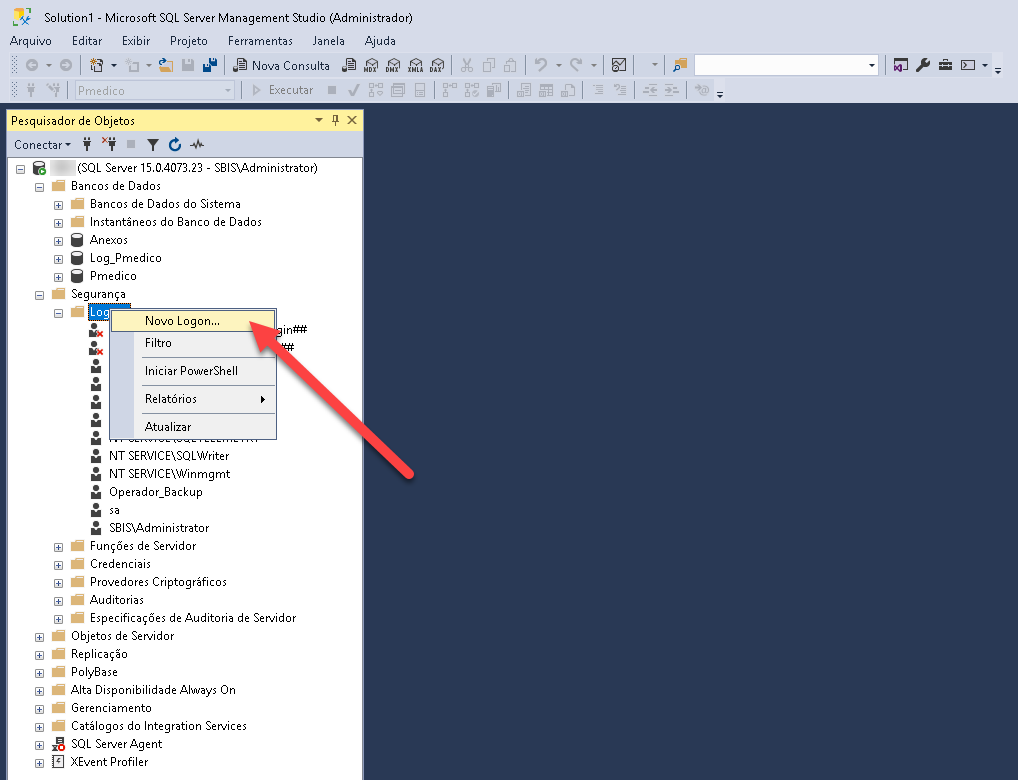 . Abra o SSMS (SQL Server Management Studio) do SQL Server e logue com usuário que tenha direito de sysadmin para conseguir criar o usuário.